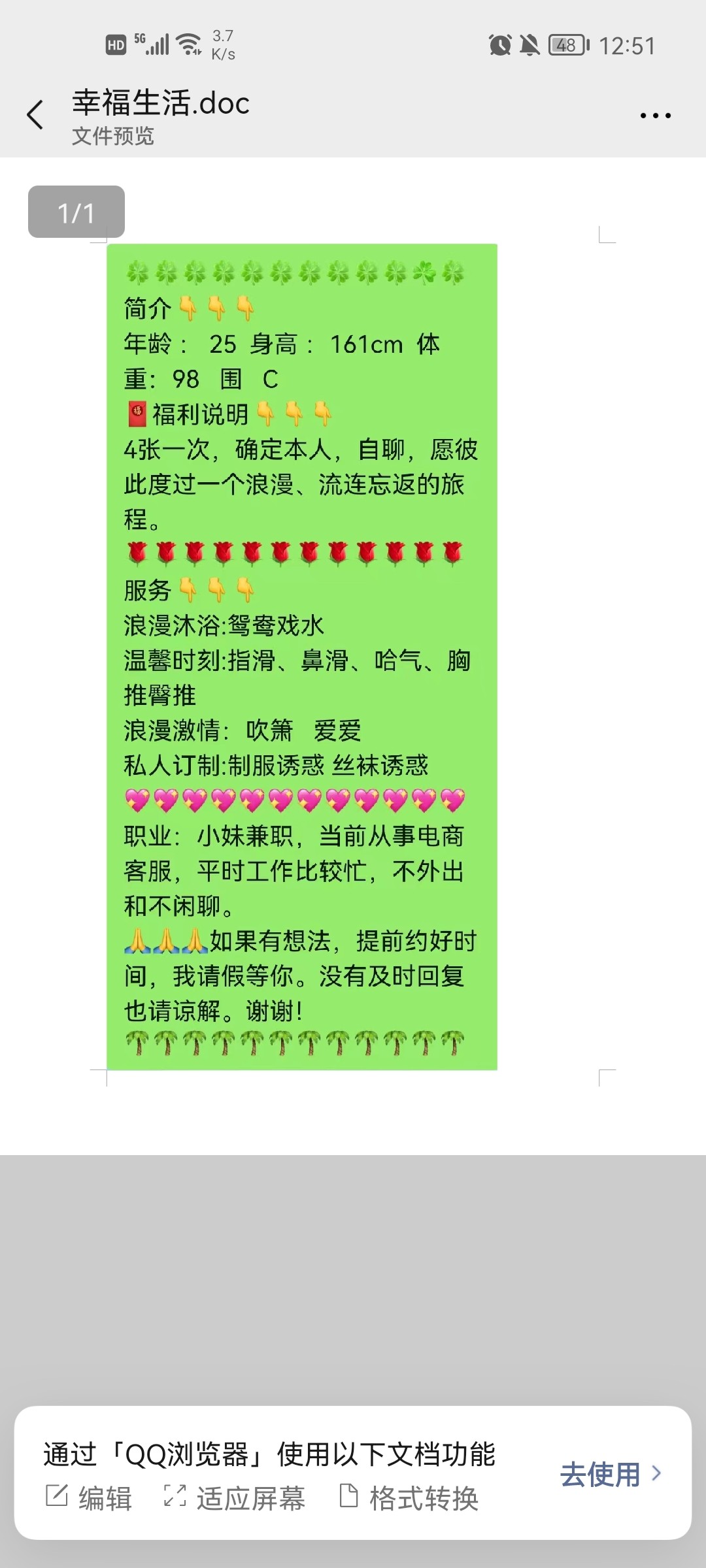 探探上找的,她说自己是兼职,朋友圈只能看到她发的视频,真人与视频完全不符,服务冷淡,不足钟,描述的指划鼻划,和以下各种服务都没有,岁数看着也不小了完全没感觉浪费钱。(看到她发的服务链接叫“幸福生活”住址发在“赛银国际”直接跑就完事了  )